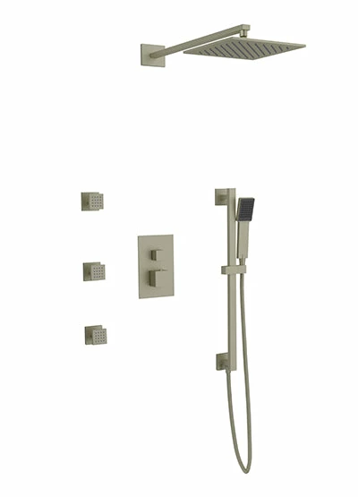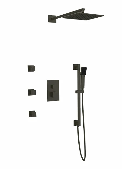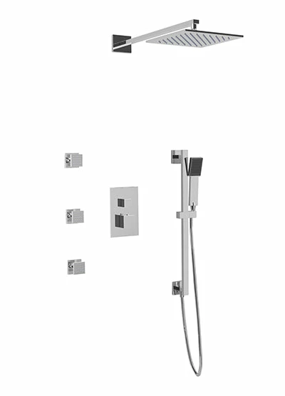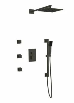 PS123 – Square Thermostatic Shower Trim Kit With Wall Mount Shower Head, Hand Held Shower On Slide Bar, Body Jets